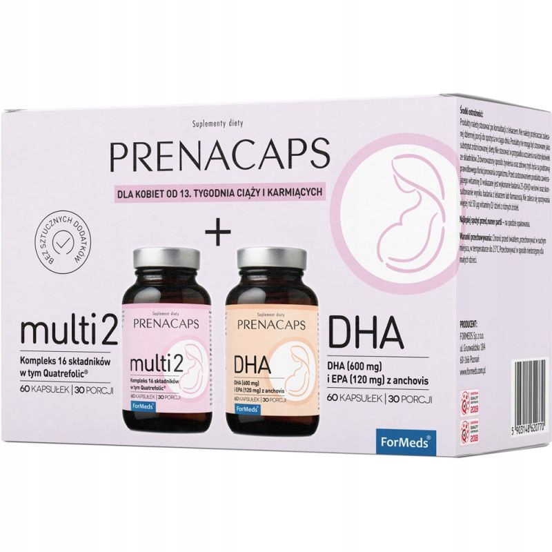 - PRENACAPS DHA містить 600 мг ДГК і 120 мг ЕПК, отриманих з риб'ячого жиру анчоусів. Продукт перевірений на вміст важких металів. Команда Польського гінекологічного товариства рекомендує споживати принаймні 600 мг DHA вагітним і годуючим груддю. Він також рекомендує, щоб джерелом рибної DHA була дрібна риба.
