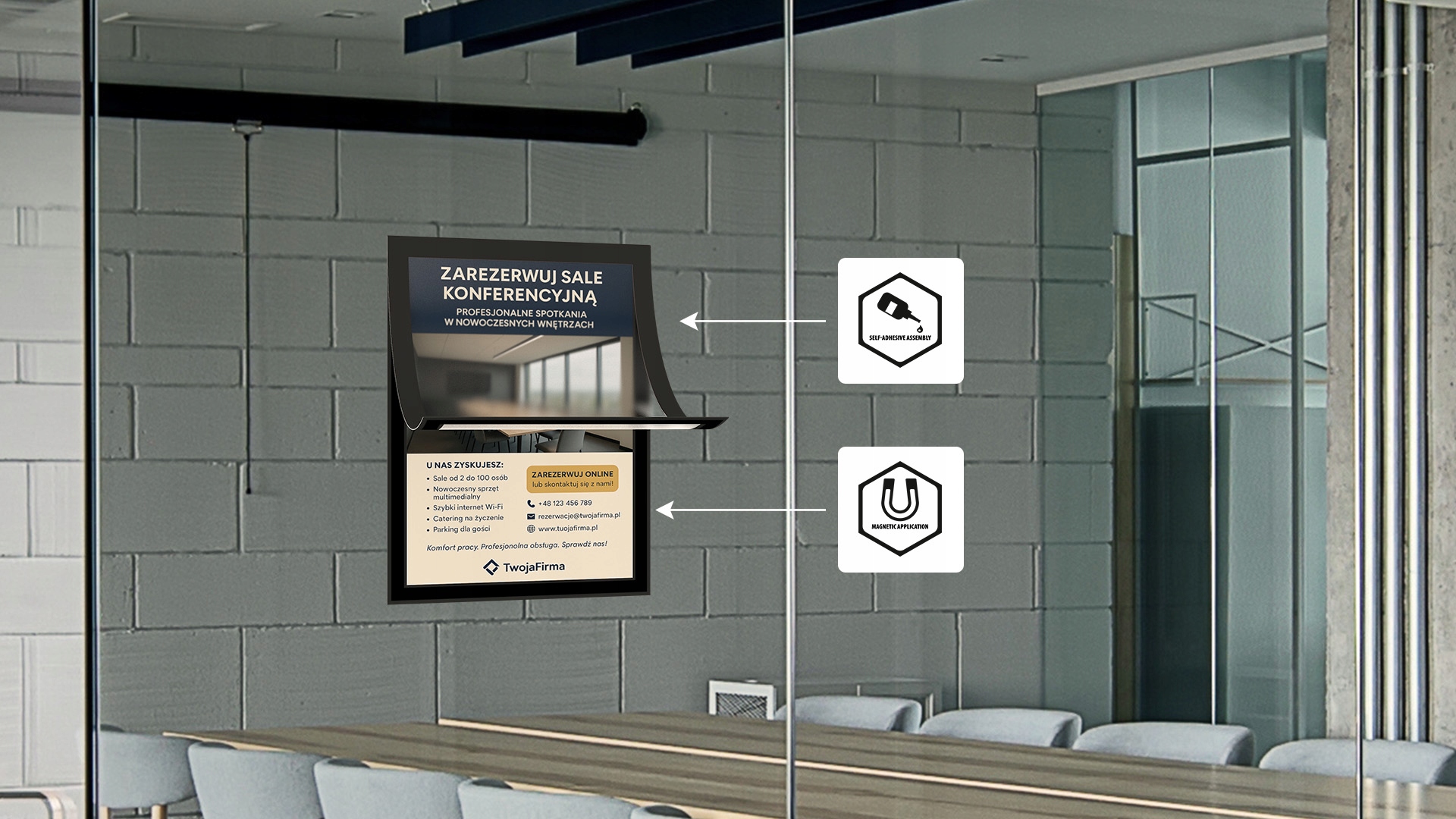 самостійна рамка фольги з ПВХ -це продукт, який ви можете легко прикріпити до гладких поверхонь, таких як стіни, двері та меблі. Застряг у потрібному місці, це дозволяє відображати вибраний вміст у форматі A4.