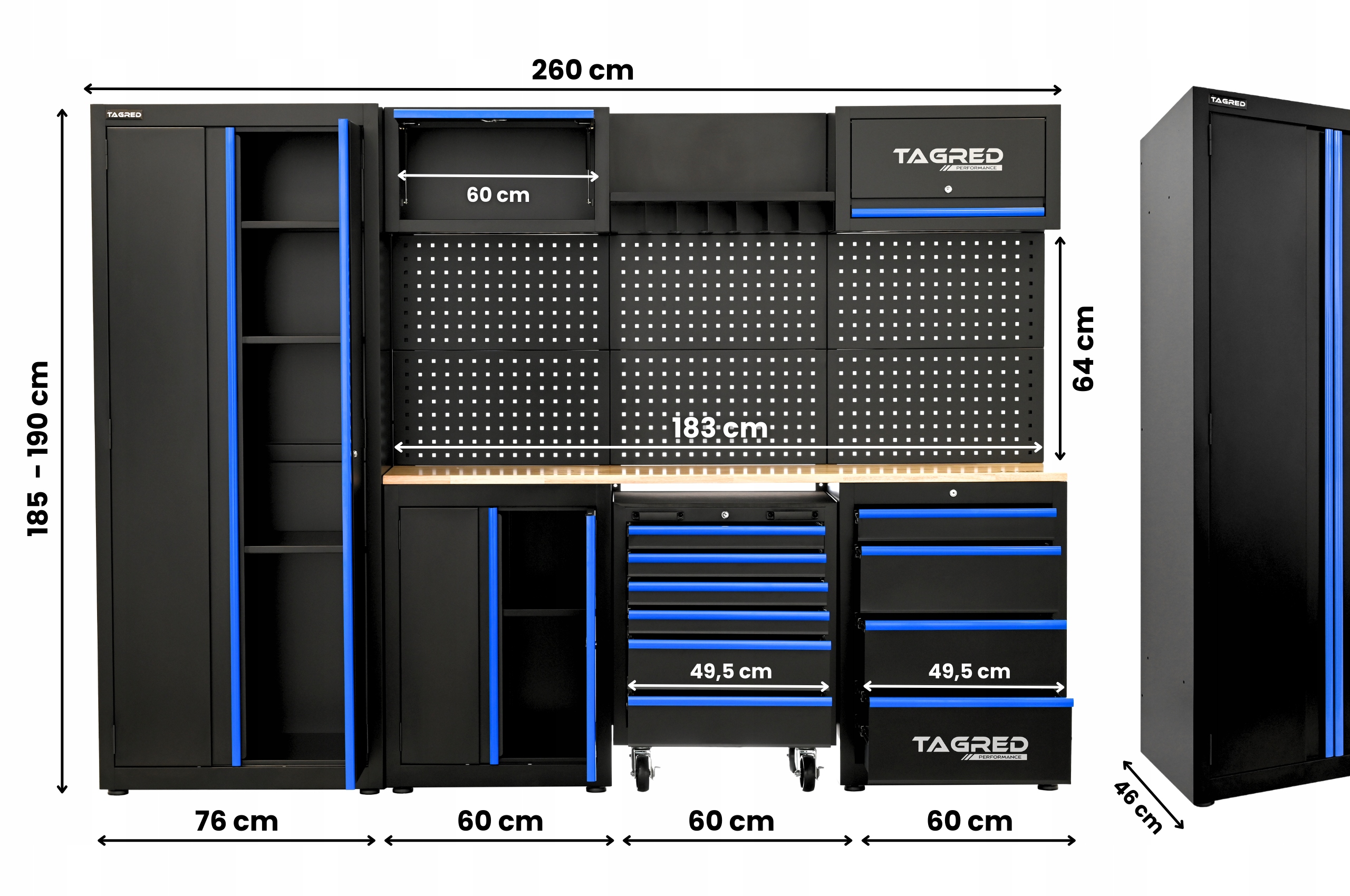Набір меблів для майстерні, призначений для професіоналів і вибагливих ентузіастів DIY. Міцна конструкція, величезний простір для інструментів, функціональність і довговічність - цей набір виправдає очікування навіть найвибагливіших користувачів.