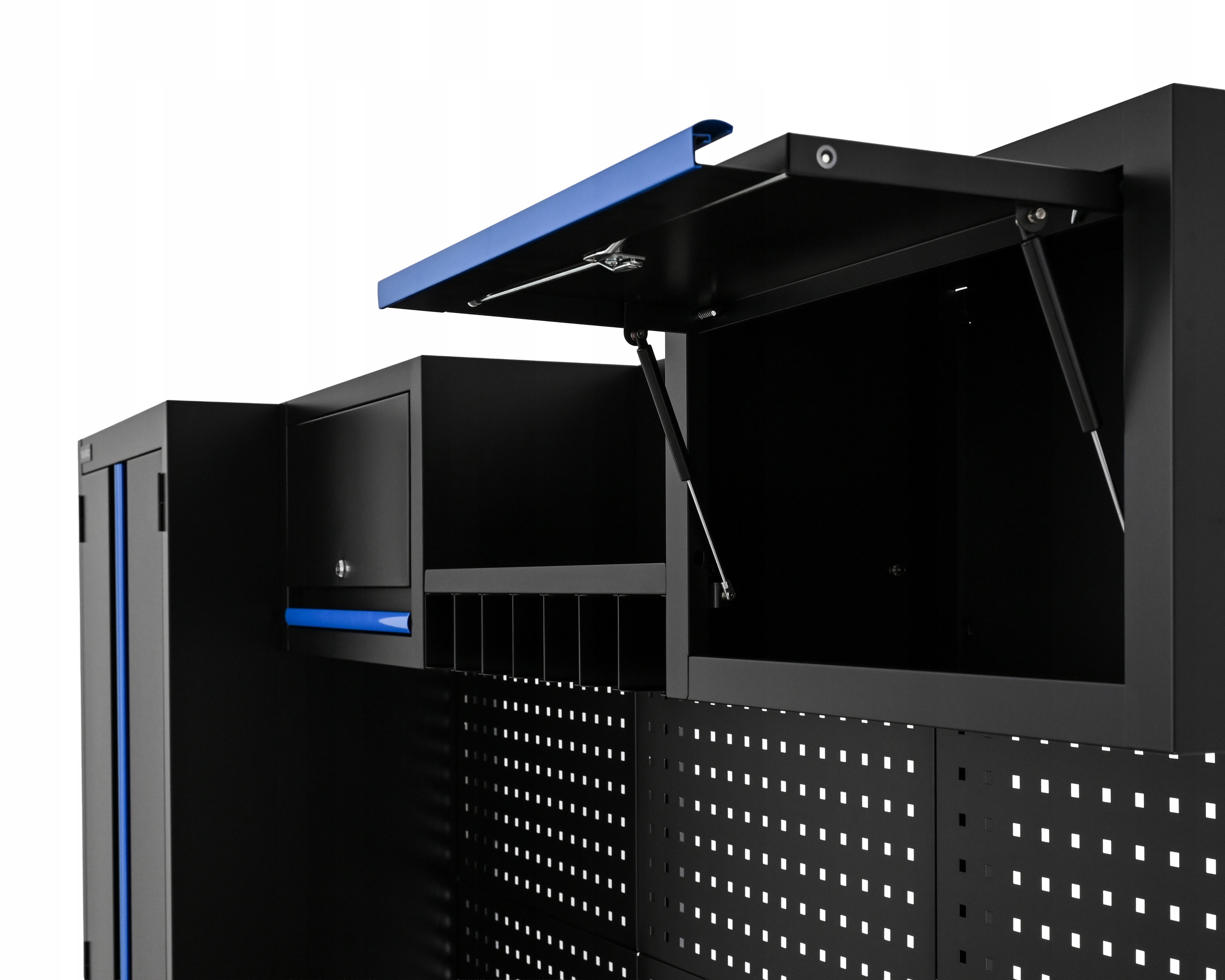 У комплект входять: шафа з полицями, шафа з ящиками, модуль - органайзер з 7 тримачами для електроінструментів, нижня шафа з полицею, шафа з ящиками на коліщатках, перфорована сталева панель і стільниця.