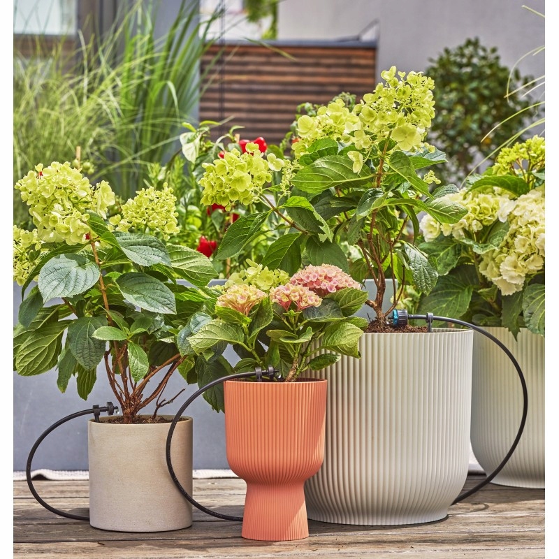 Мікропідпудна система. Заради рослин і кожна цінна крапля. Легка, точна та економлять воду та час. Кінцева крапелька з компенсацією тиску забезпечує постійний потік води зі швидкістю 2 літри на годину, що підходить до балконів, терас та в місцях, де є відмінності висоти.