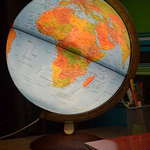 Встановлюється на дерев'яну основу з вітражем і металевий меридіан. Карта польською мовою. Розмір м'яча 30 см, висота 38 см. Легка заміна лампи.