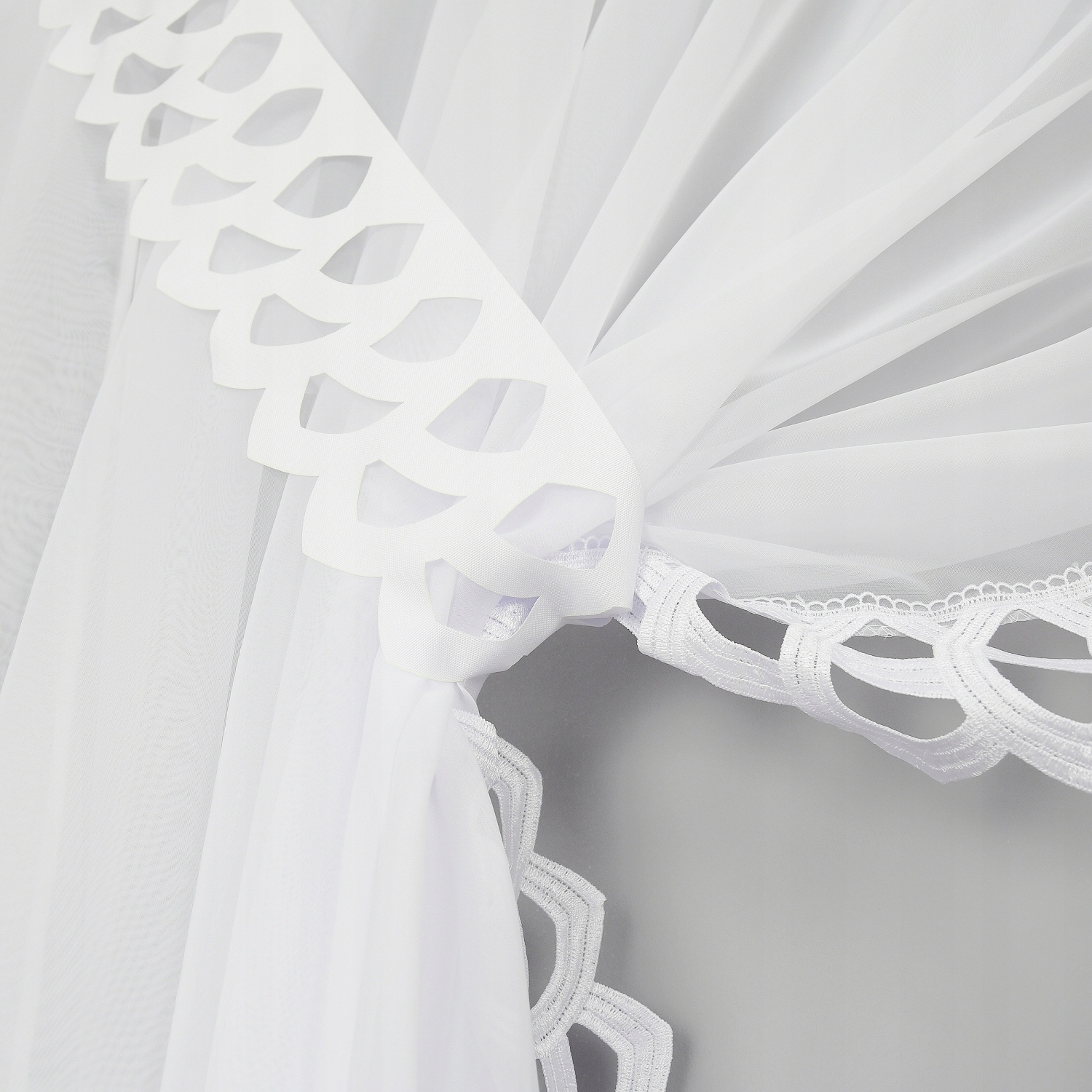 Декоративна штора з високоякісної гладкої вуалі та гіпюру з обробкою на краї штори. В набір входять дві ажурні підв'язки для кріплення штори.
