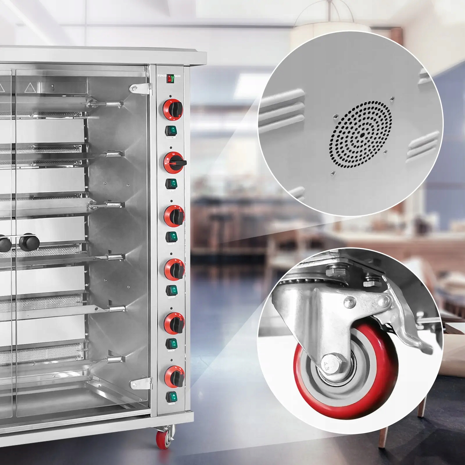 - - Курячий гриль із обертовим вертелом призначений для постійної роботи завдяки двигуну з металевими редукторами та вентилятором, що охолоджує основні компоненти,