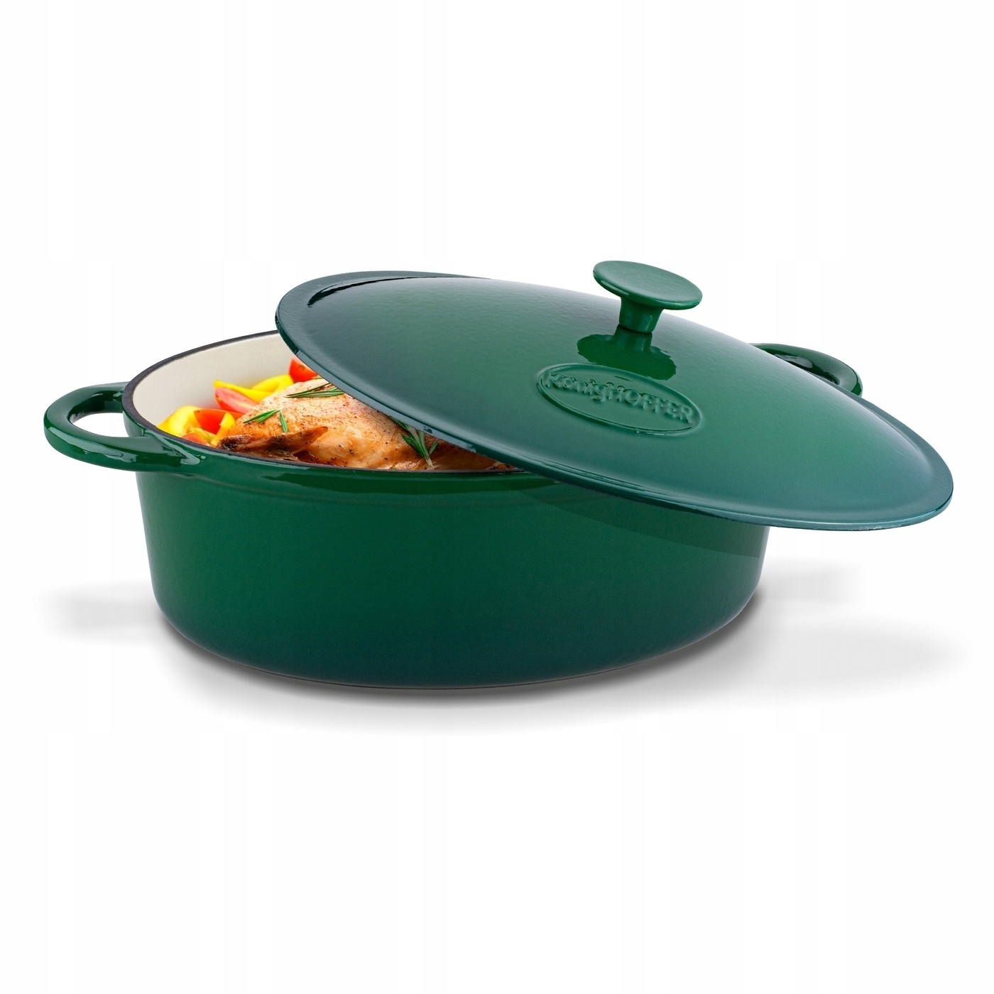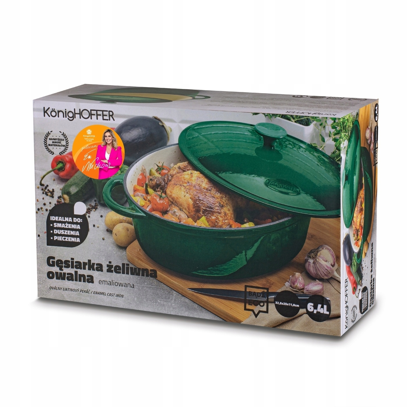Емальована чавунна гусятниця Konighoffer 6,4 л — овальна, важка і міцна. У ньому можна варити, тушкувати, смажити і запікати страви. При використанні страви в духовці температура не повинна перевищувати 250 градусів С. Однак продукт дозволяє розігрівати страви протягом багатьох годин, тому він ідеально підходить для запікання цілої птиці (наприклад, качки). Завдяки чавунній кришці, що входить в комплект, ви можете регулювати кількість пари всередині гусятниці. Модель має класичний вигляд і здатна підкреслити домашній характер і затишний декор Вашої кухні. У ньому навіть можна спекти традиційний хліб на заквасці. Розміри смарагдового гусака 32,5 х 25 х 11,8 см. Продукт рекомендований Ewa Wachowicz. Як амбасадор бренду Konighoffer, вона тепло та з усмішкою рекомендує його для домашнього використання. Разом з ним ви отримаєте свій рецепт для дому. Це один із найкращих варіантів у цій категорії!