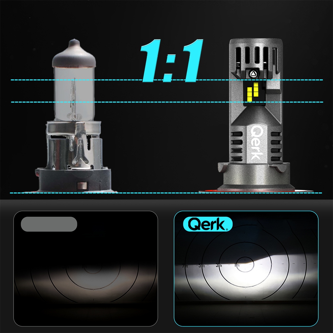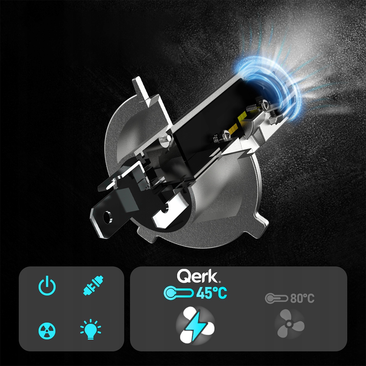 Помістивши турборадіатор в модернізований корпус, можна встановити його так само, як і звичайну галогенну лампу. Більше немає необхідності використовувати перехідники для розеток з нетрадиційним монтажем. Це нова модель з конструкцією з турбовентилятором, розміщеним у нижній частині конструкції, що дозволяє використовувати ще більш потужні чіпи CHIP LED QERK® Q11 7020з безпрецедентним світловим потоком.