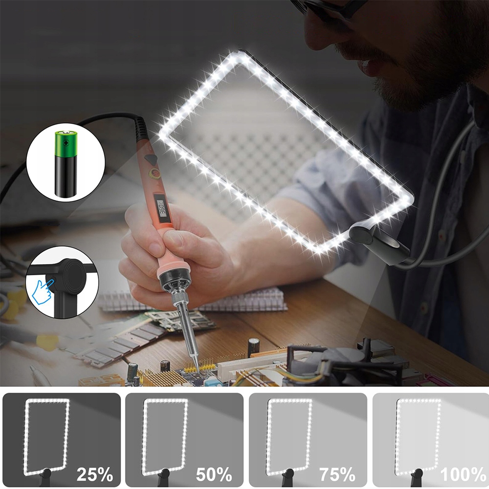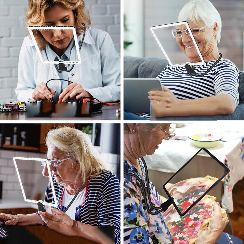 Еластична шия дозволяє свободі рук. Ви можете встановити об'єктив під будь -яким кутом, не турбуючись про його стабільність. Цей лукавський лукавець буде ідеальним як подарунок для вад в погіршенні або з порушеннями зору. Вони можуть читати, вишивати, шити, ремонтувати, займатися та виконувати інші заходи, не опускаючи голову. Ідеально підходить для тривалого використання.