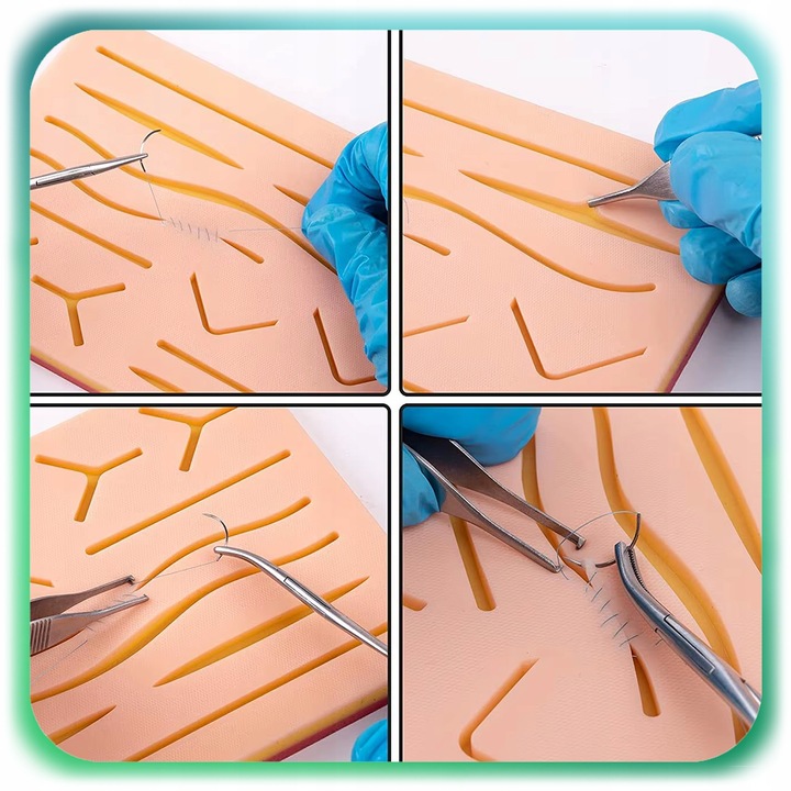 ✔ У наборі ви знайдете: ножиці, голки, кліщів, плутці прикріплених хірургічних ниток з голкою, що забезпечують реалістичні практичні вправи.