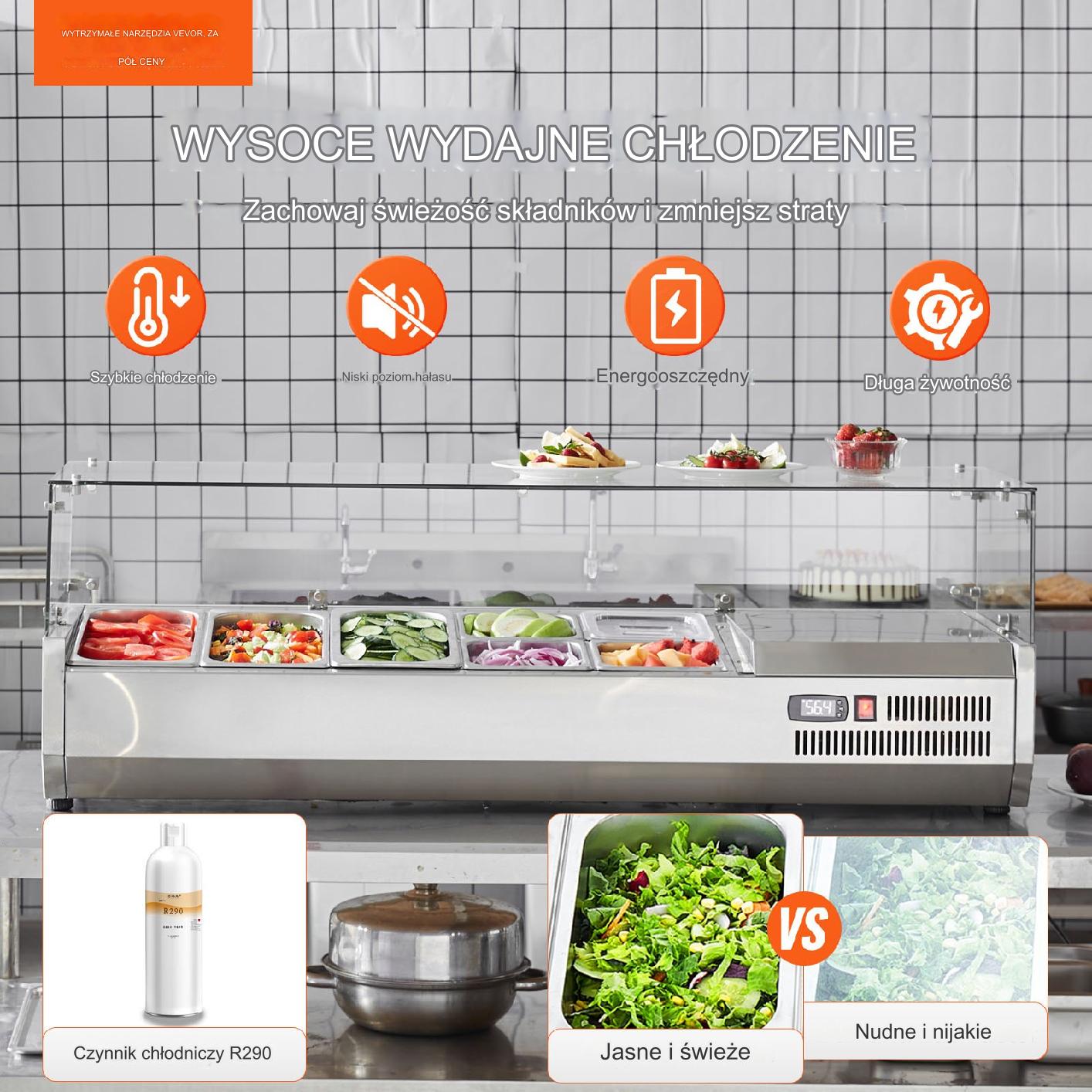 Ефективний компресор 150 Вт гарантує, що спеції, бутерброди та інгредієнти салату зберігаються при потрібній температурі. У поєднанні з холодоагентом R290 пропонує надійний охолоджуючий ефект, блокує поживні речовини та вологу в їжі та працює тихо та ефективно. Це, безсумнівно, ідеальний вибір для комерційного використання. Переконайтесь, що електричне середовище є доречним - напруга AC220-240V 50 Гц.