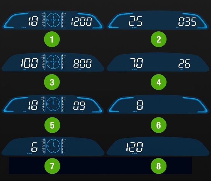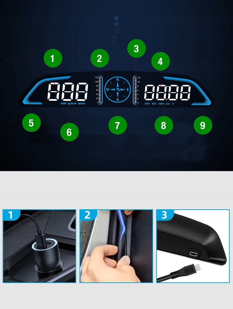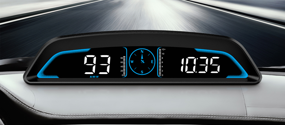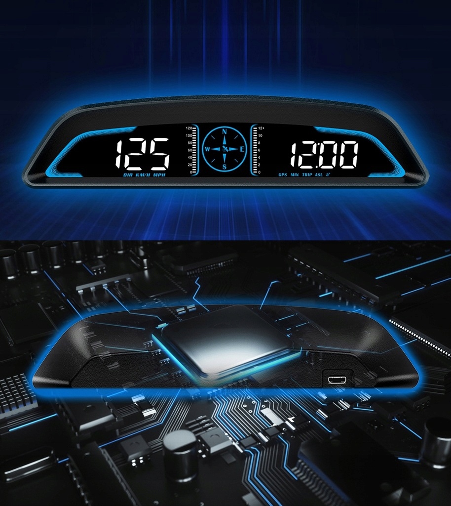 - Функції, які підтримує дисплей: спідометр, компас, сигналізація швидкості, сигнал втоми, прискорення до 100 км/год, кількість супутників, напрямок руху