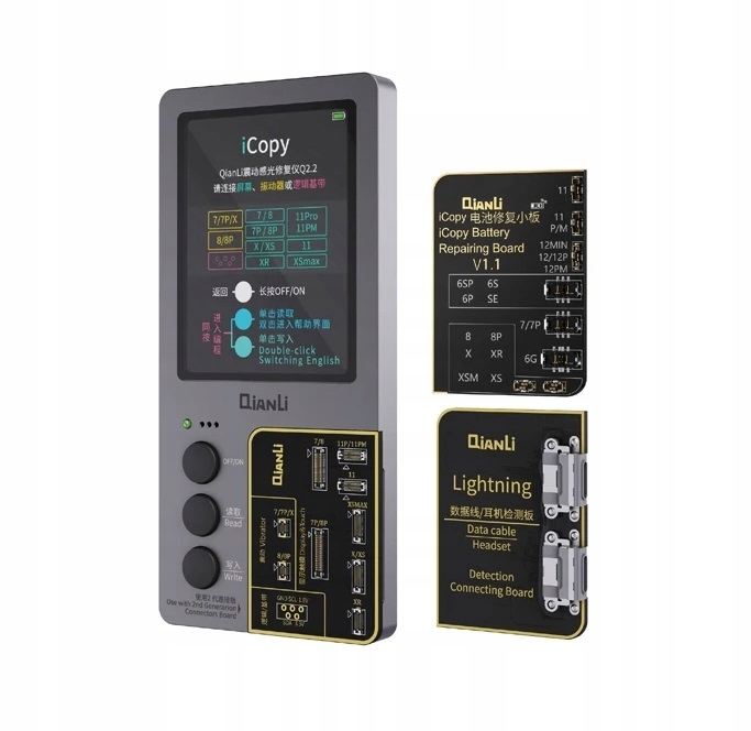 Пристрій, призначений для програмування та діагностики пристроїв Apple. Багатофункціональний інструмент дозволяє нам виконувати основні дії, необхідні для обслуговування iPhone. У комплект з програматором входять 2 плати розширення, завдяки яким ми можемо розширити пристрій додатковими функціями. iCopy оснащено портом Lightning, через який подається живлення, і РК-екраном, який можна читати. Крім того, ми можемо розширити можливості, встановивши спеціальне програмне забезпечення QianLi Repair Helper, доступне на офіційному сайті виробника.