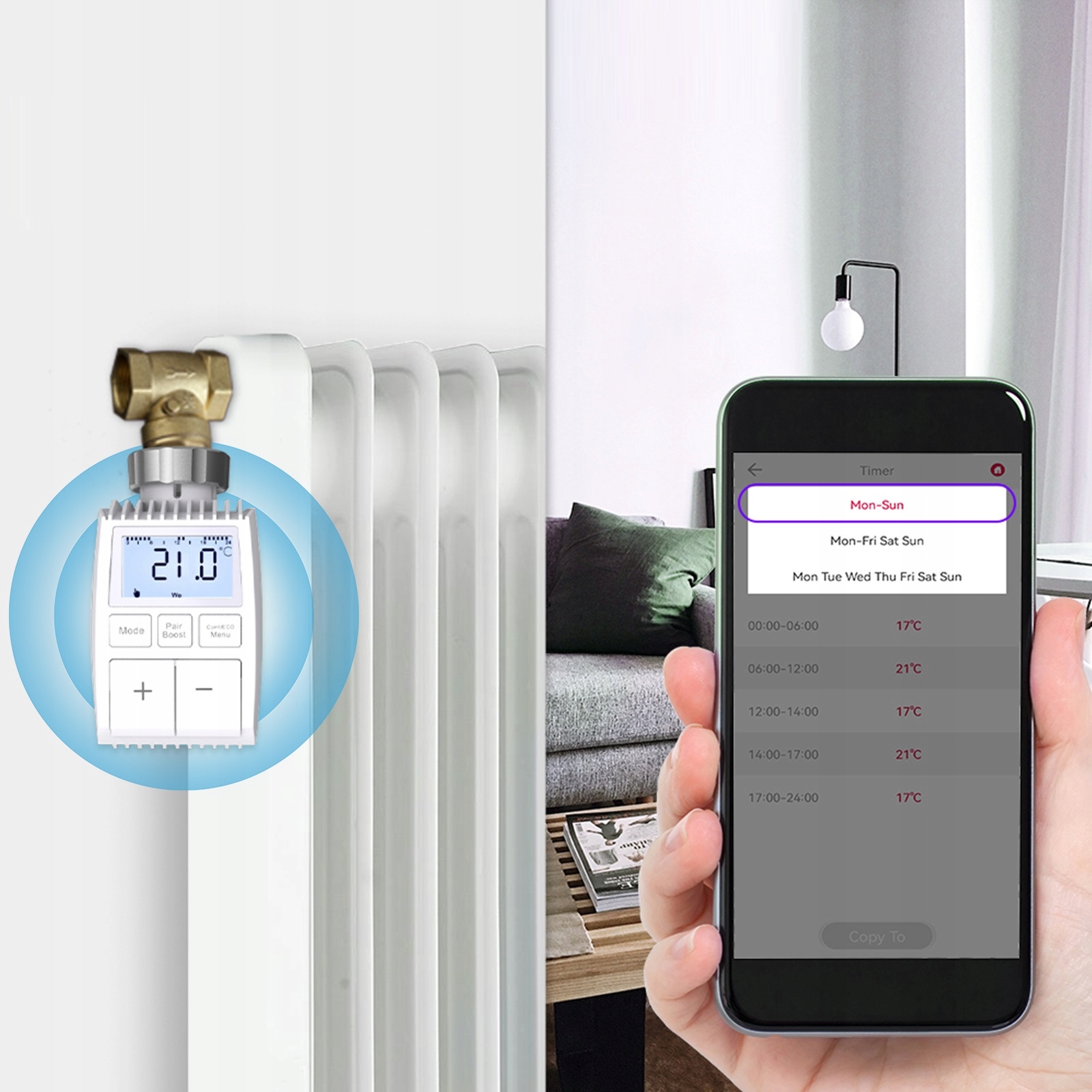 Термостат опалення забезпечує індивідуально настроювану комфортну температуру, відповідну кімнаті, значення якої відображаються в додатку. Термостат опалення підтримує Alexa та Google Voice Assistant для голосового керування.