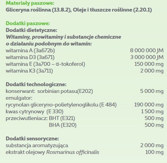 suplexan adek premium -склад вітамінів A, d3, e, K. Приготування доповнює дієту тварин з жирними -розпусними вітамінами. Особливо рекомендується доповнити добову дозу в початковий період, в якому ці вітаміни необхідні для належного росту та індукції природної стійкості до захворювань. Продукт також рекомендується в харчуванні курей укладання під час періоду вилуплення для регулювання межі кальцію та підвищення твердості оболонки. 4 Він може бути використаний у будь -який виробничий період, не вимагає пільгового періоду.
