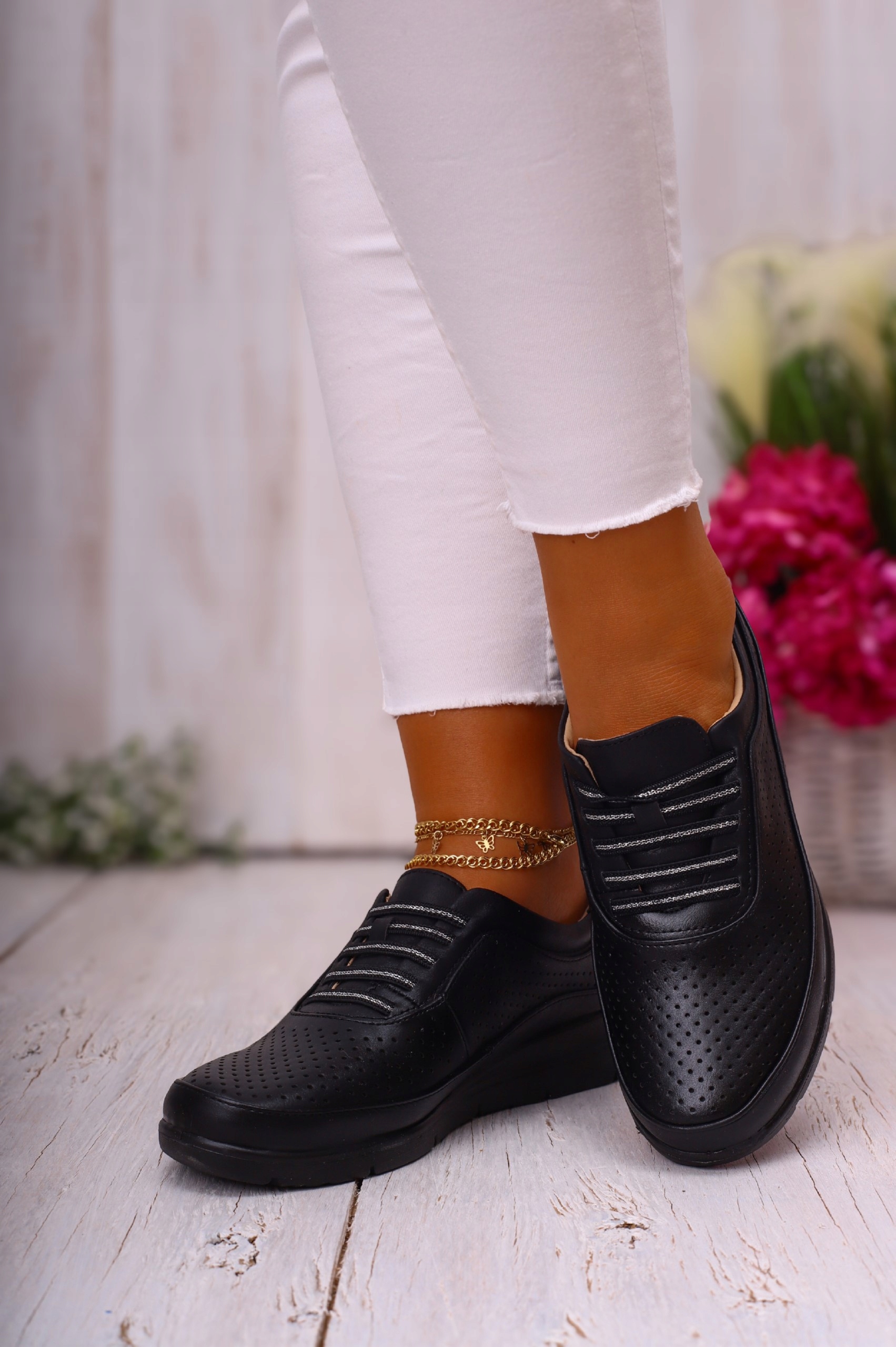 Відкриті роботи, жіноче взуття з чорними вирізами на низькому клині. Ідеально підходить для теплих днів. Вони працюватимуть як щоденне або робоче взуття. Замертована модель полегшує взуття до стопи. Виготовлений з хорошої якості матеріалів. М'яка шкіряна устілка забезпечує комфорт. Простий розріз легко адаптується до багатьох стилізацій.