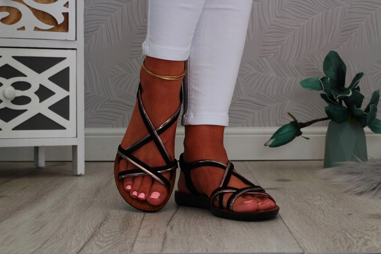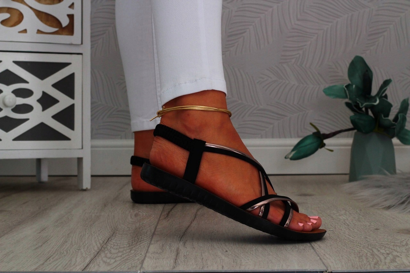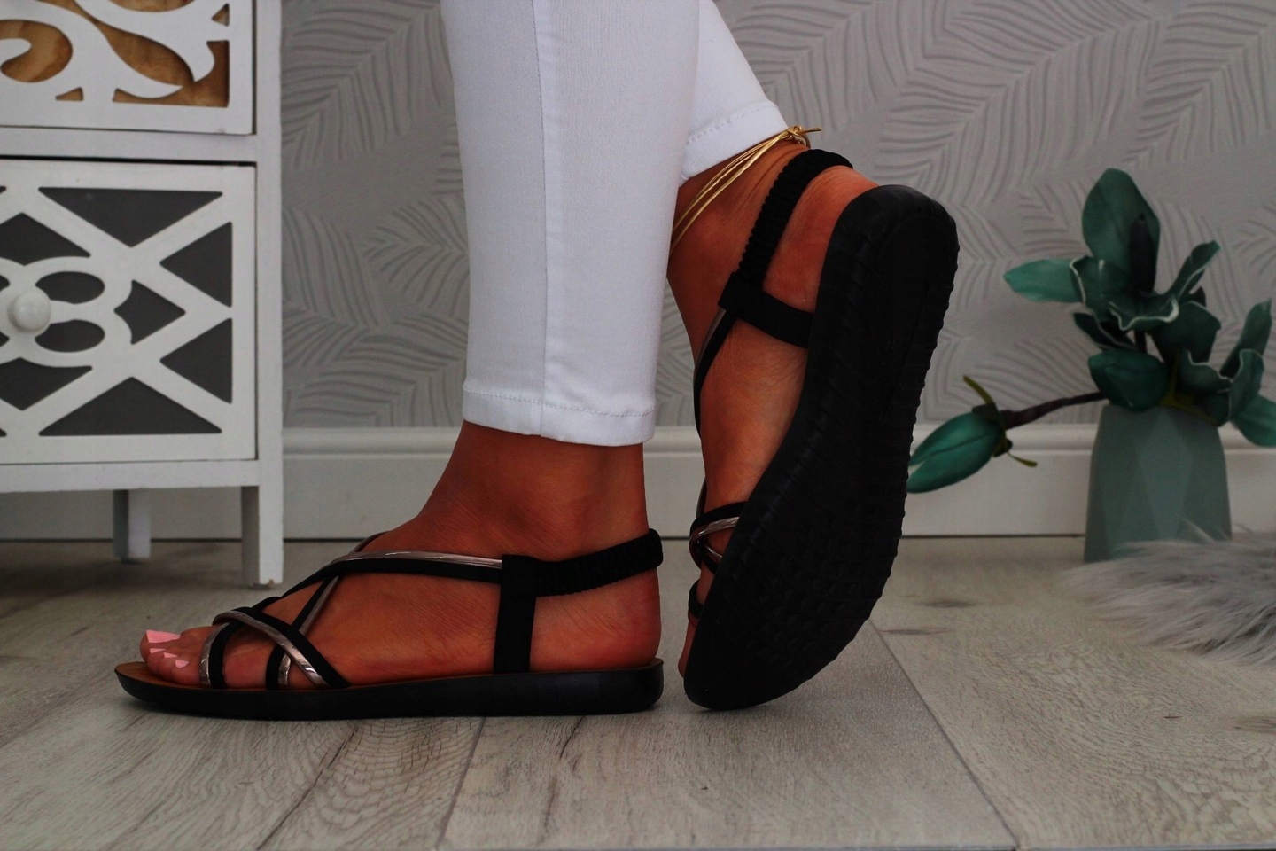 Жіночі чорні босоніжки на плоскому дно. Ідеально підходить як взуття щодня влітку, спекотні дні. Простий зріз також пристосуватися до елегантних стилізацій. Еластичний ремінь на п'яті полегшує взуття і полегшує відповідність різному ділянці стопи.