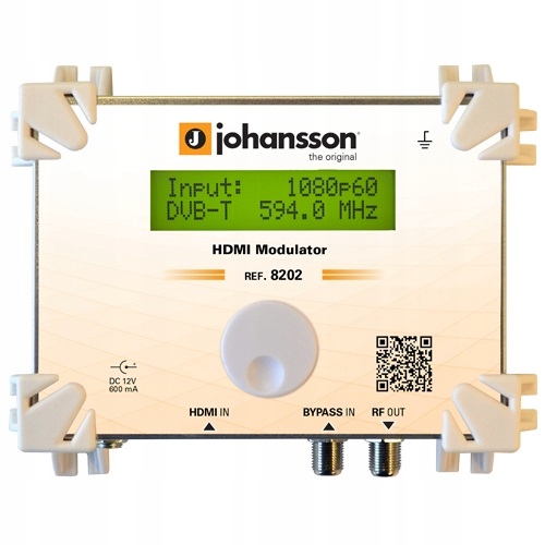 Моделятор цифрового модулятора Johansson Model 8202 перетворює сигнал з джерела HDMI на DVB-T або DVB-C. Дисплей, меню, кероване багатофункціональною ручкою. Низьке споживання електроенергії Високоякісна сигнали MER 38db