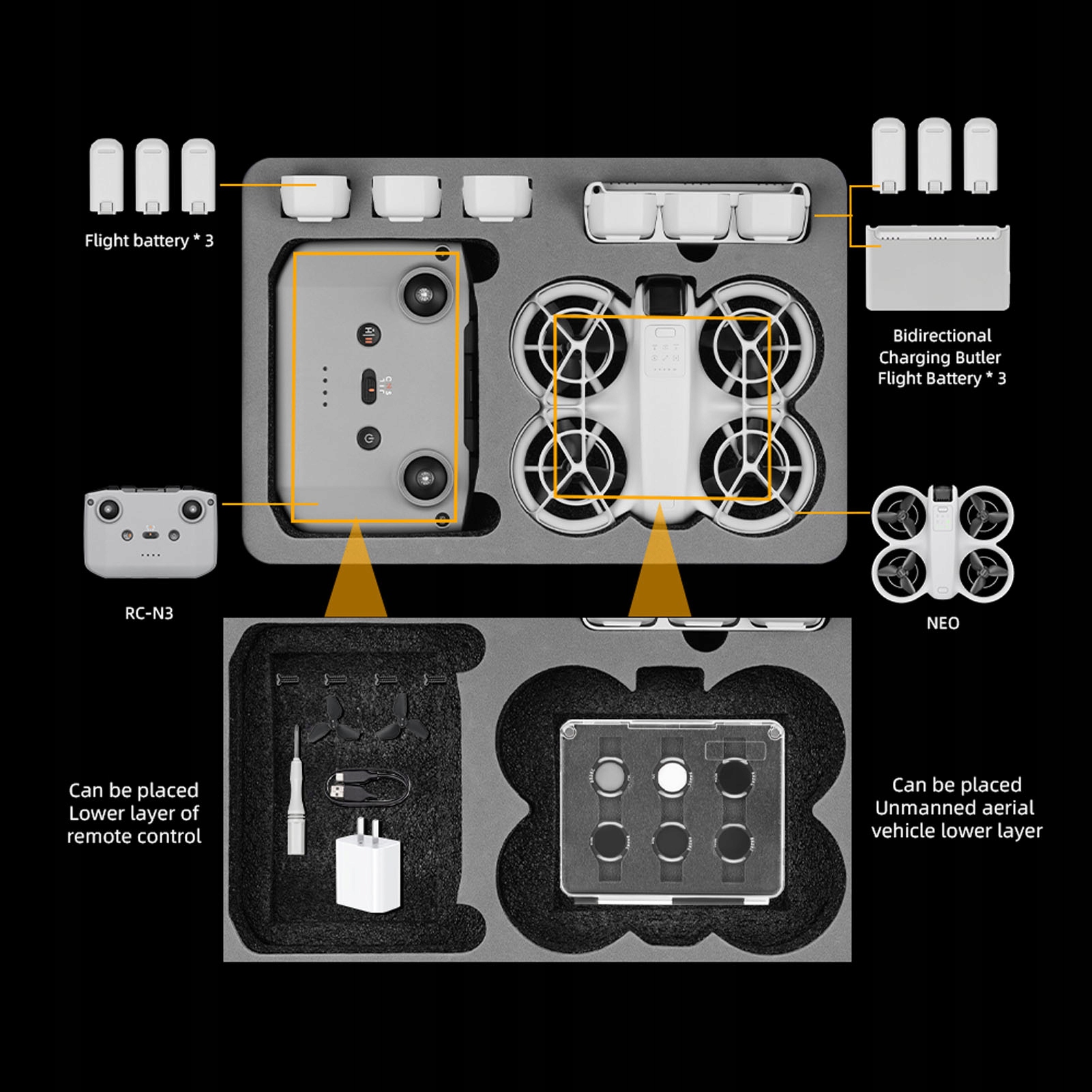 1. Non-standard design: for Neo Hard Travel Cage equipped with a non-standard foam insert designed especially for Neo Combo with a remote RC-N3 controller and more drone accessories