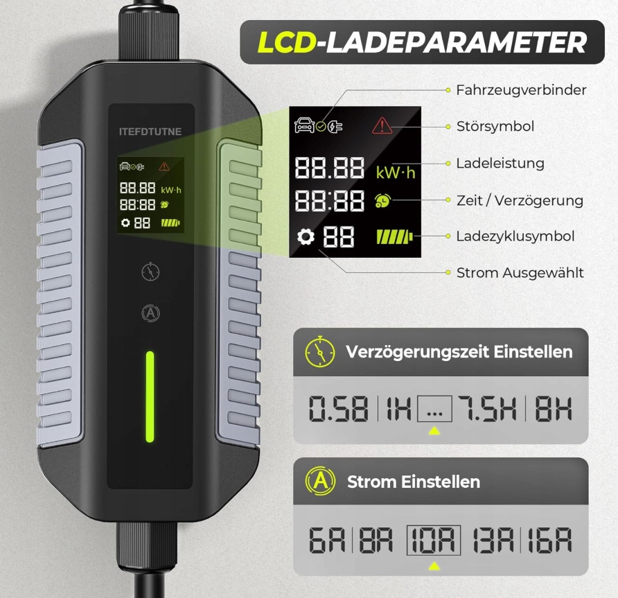 - 【міцний та практичний дизайн】: 7 м кабель забезпечує гнучкість та комфорт під час зарядки. Він довговічний і підходить для всіх погодних умов, що забезпечує довгу та надійну продуктивність. 4 (Примітка: Коли ви використовуєте адаптер CEE для Schuko, потужність зарядки змінюється з максимум 11 кВт до максимум 3,68 кВт. Точна кількість створеної потужності залежить від кількості потужності, яку ви хочете використовувати).