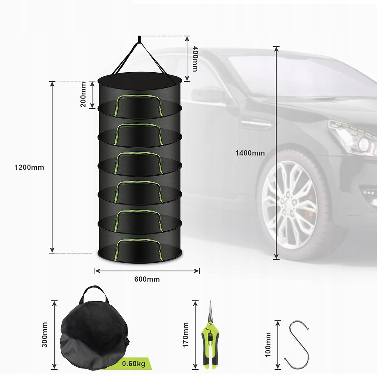 Трави для сушіння трави 6, що складаються, сушіння сітки φ 60 см х 120 см заввишки на блискавці, висить суха сітка для сушіння трави з різаннями ножиць і гачків (чорний і болоресцентний зелений)