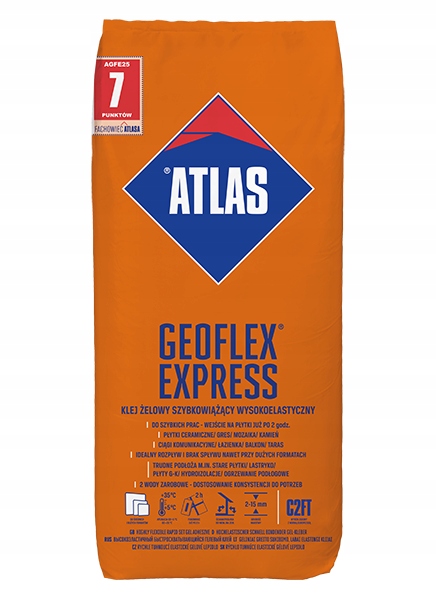 - Atlas Geoflex Express виробляється у вигляді сухої суміші найвищої якості цементу, агрегатів та спеціально вибраних модифікуючих агентів: природних та синтетичних