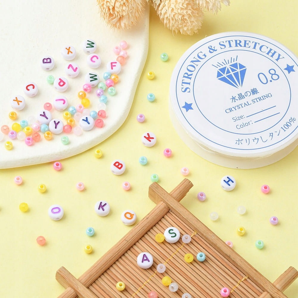 Набір намистин в організаторі в наборі з рибальською лінією. Кульки з намистинами - перлини та райдужні - і намистини алфавітних букв.
