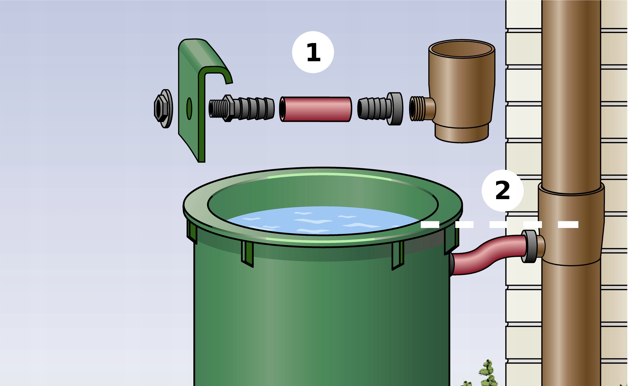 Колектор води перехоплює дощову воду з зливної труби, поки вода в резервуарі не досягне рівня, на якому встановлено колектор. Надлишок тече на зливній трубі.