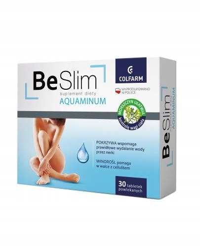 Надмірне накопичення води в організмі може бути спричинене різними фізіологічними та гормональними змінами, які відбуваються в організмі, але також внаслідок неправильної дієти або відсутності фізичної активності. Be Slim Aquaminum - це складна дієтична добавка, що містить такі натуральні інгредієнти, як: екстракт трав'янистої трави, плоди лози, кульбаби, зелений чай, фолікулярна плоть і інжир. Трав'яний екстракт кропиви посилює виведення води нирками та підтримує життєву силу організму, що дозволяє відчути потік енергії. Екстракт листя зеленого чаю також збільшує виділення води нирками, а також належним екстрактом виноградної лози підтримує антиоксидантний захист ДНК, білків та ліпідів. Завдяки впливу збільшення бета-окислення жирних кислот, це допомагає досягти та підтримувати нормальну масу тіла для зменшення жиру. Крім того, цей інгредієнт відповідає за підтримку ліпідного обміну та контролю за апетитом. Правильний екстракт лози підтримує схуднення та контроль ваги та полегшує зменшення целюліту. Екстракт кореня Mrind - ще один інгредієнт, який збільшує виділення води нирками та сприяє антиоксидантному захисту організму. Екстракт фруктів Figen -Peak підтримує метаболізм жиру та контроль ваги. Він також полегшує підтримку нормального рівня глюкози в крові та контролю апетиту, тоді як екстракт з фолікулярного листя листя збільшує відчуття ситості після їжі та полегшує підтримку належної ваги. Крім того, він підтримує енергетичний метаболізм, і завдяки вмісту йоду підтримує правильну функцію щитовидної залози.