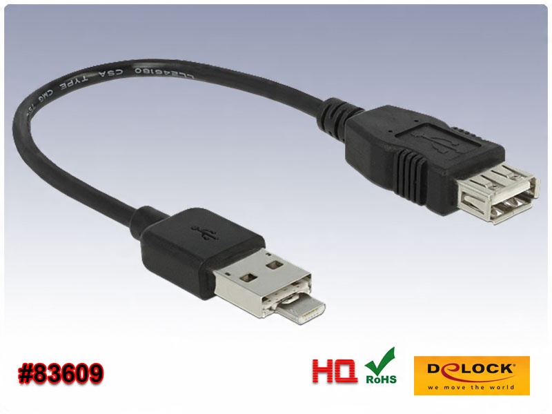 Кабель USB від Delock оснащено інтелектуальним комбінованим роз’ємом USB 2.0 типу A + Micro-B і пропонує багато можливих застосувань. Вилка Micro-B інтегрована в роз’єм типу A, і її можна легко вставити або витягнути. У разі використання роз’єму USB типу A цей кабель функціонує як подовжувач USB. При використанні висувного роз'єму Micro-B цей кабель дозволяє підключити, наприклад, жорсткий диск або карту пам'яті через стандартний USB-штекер до смартфона або планшета з підтримкою OTG. Функція OTG використовується для прямої передачі даних між портативним пристроєм і носієм масової інформації без підключення до комп’ютера.