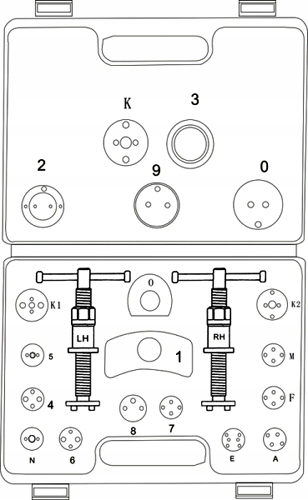 Набір включає два преси (правий і лівий поворотний), дві різні за формою балки для притискання преса до сідла супорта та 17 адаптовані адаптери до розміру гальмівних поршнів, які використовуються в більшості легкових автомобілів, вироблених на європейському та азіатському ринках.