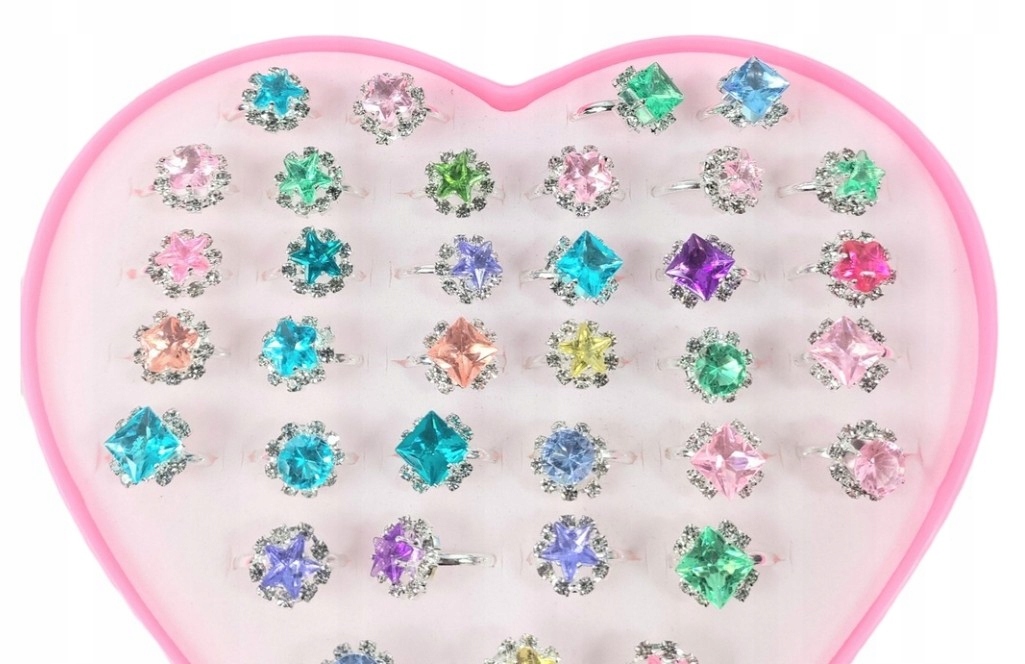 - 36 каблучок з блискучими елементами поміщені в коробочку у формі серця.
