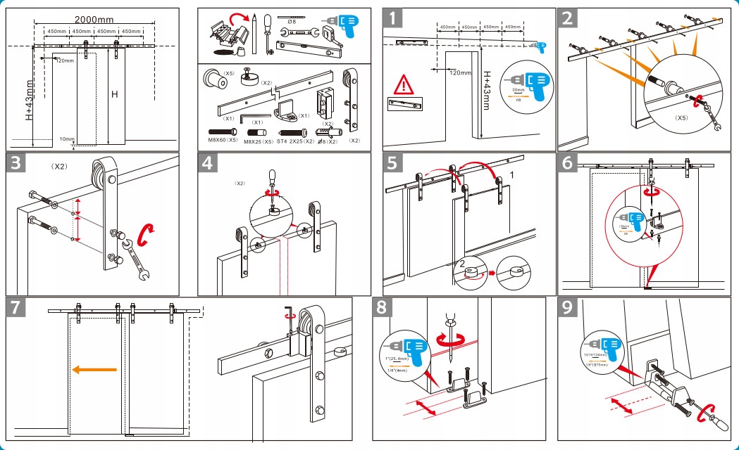 Комплект системи розсувних дверей BARN DOOR призначений для самостійного монтажу. Набір містить точні інструкції, які дозволять вам ефективно встановити розсувні двері вашої мрії у вашому домі за 9 простих кроків!
