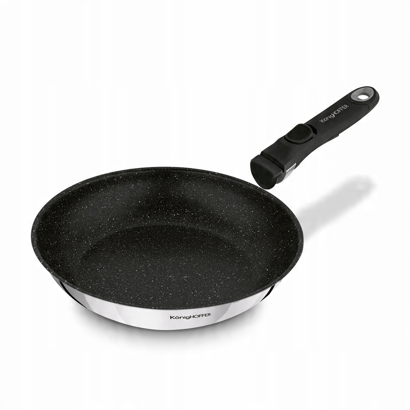 Набір сковорідок Konighoffer Colate 20/24/28 см з антипригарним покриттям з кам'яним покриттям виготовлений з нержавіючої сталі. Завдяки цьому він ідеально збалансований і зручний. Його підвищена міцність забезпечується покриттям, яке зменшує прилипання їжі. Його висока якість, твердість і структура розроблені з урахуванням тривалого смаження. Енергоефективність забезпечується спеціальною конструкцією дна. Завдяки цьому ви можете використовувати сковороду Colate на будь-якій плиті. Антипригарне покриття також дозволяє смажити з невеликою кількістю жиру та легким доглядом. Він також може витримувати багато циклів стирання (більше, ніж звичайний антипригарний мармуровий посуд, доступний на ринку). Перенесення і використання набору забезпечується ручкою, яка повільно нагрівається і надійно лежить в руці. Він універсальний і знімний, тому підходить для будь-якого діаметру сковороди з мармуровим покриттям Stone Colate. З його допомогою буде набагато легше розмістити посуд в кухонній шафі або ящику. З цим набором ви легко зможете створити власний набір кухонного посуду для домашнього використання та для всієї родини. Це один з кращих варіантів в цій категорії - знявши ручку, ви можете мити представлені каструлі в посудомийній машині!