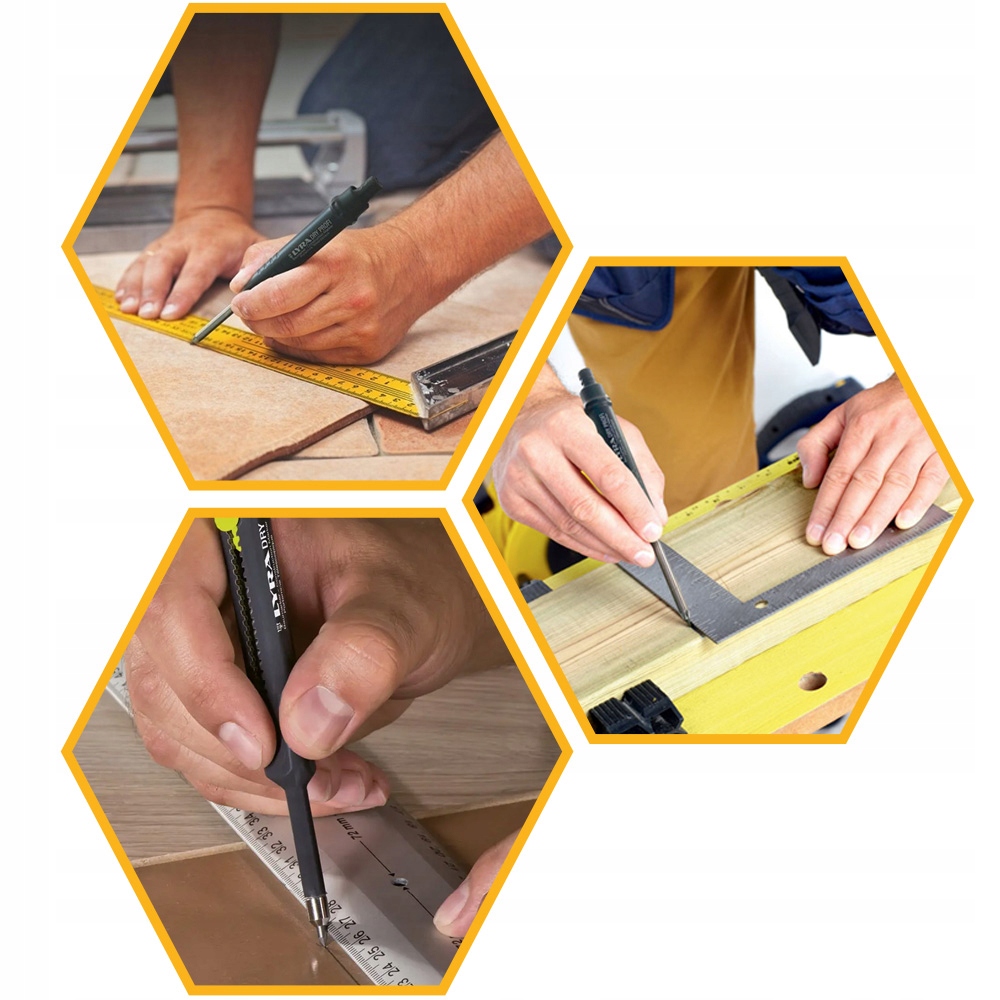Високоякісні будівельні насадки для олівців, виготовлені з високоякісного графіту, що гарантує надійність, довговічність і точність під час письма Вони пишуть на поверхнях, таких як: метал, пластик, кераміка, дерево, камінь, цегла, електроустановки тощо.Вони залишають сліди навіть на брудний, жирних, вологих, ламінованих або темних поверхонь, що забезпечує розбірливість маркування12 заправок упакованих у міцний та стійкий футляр з дозатором, який забезпечує щоб стилуси були в одному місці та безпечно зберігалися без можливості розвалитися чи пошкодитися. пошкодження патронів, під час їх використанняФабричні заточені вставки, завдяки чому вставки готові до роботи відразу після вилучення з упаковки, що економить час і дозволяє швидко повернутися до проекту Водонепроникний, дозволяє працювати навіть при високій вологості або на поверхнях, занурених у водуТехнічні параметри