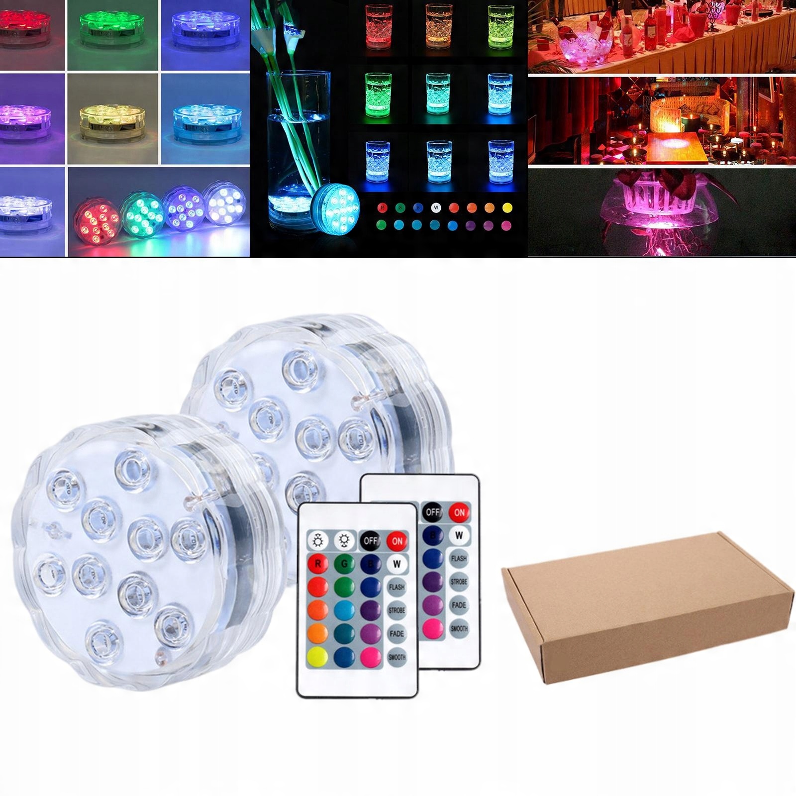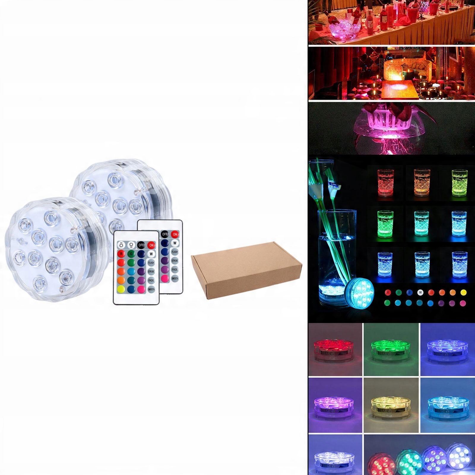 Водонепроникність IP68, 10* світлодіодів 5050RGB, які можна занурювати у воду. Пульт дистанційного керування 16 +4 статичні кольори (спалах/стробоскоп/загасання та згладжування) + регульована яскравість.