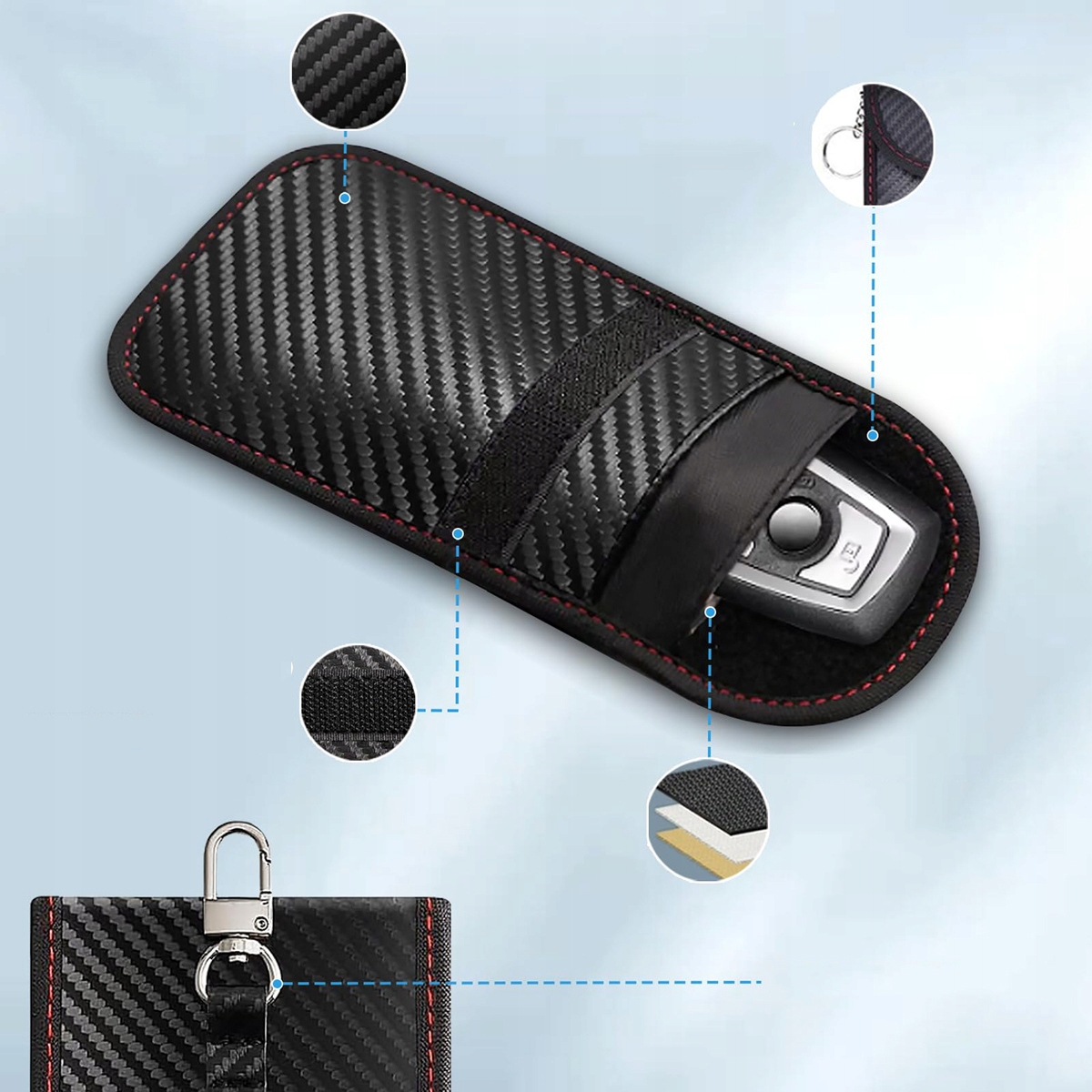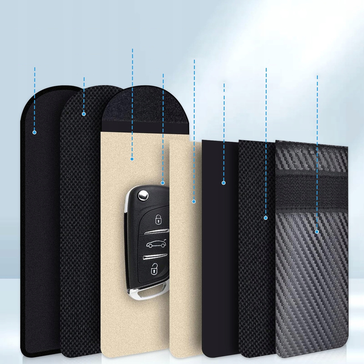 - забезпечує повне екранування сигналу для запобігання витоку інформації. Він може захистити сигнали ключа автомобіля, сигнали Bluetooth, WiFi-сигнали, GPS-сигнали, GSM-з'єднання, NFC тощо.