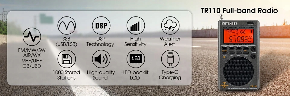 Радіостанція RETEKESS TR110 оснащена потужним динаміком, який забезпечує чистий і чистий звук, а також зручним у використанні РК-дисплеєм. Довготривалий акумулятор дозволяє годинами насолоджуватися безперервним прослуховуванням, а роз’єм для навушників дозволяє підключати навушники для більш персоналізованого звучання. Вбудована функція сповіщень NOAA (повідомлення про погоду) і технологія DSP для кращого прийому ще більше підвищують привабливість радіостанції.