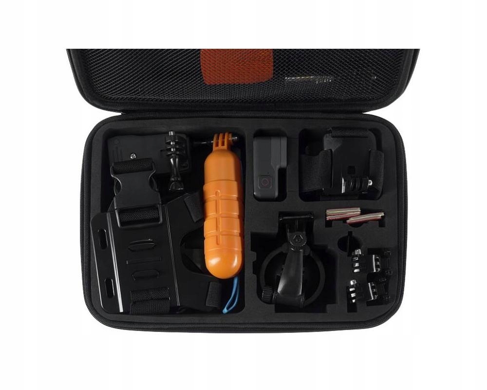 Валіза вміщає камеру з водонепроникним корпусом, аксесуари для кріплення, пов’язку на голову, нагрудні ремені, телескопічну палицю, додаткові акумулятори, зарядний пристрій і багато іншого.