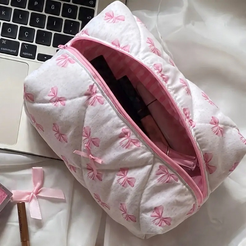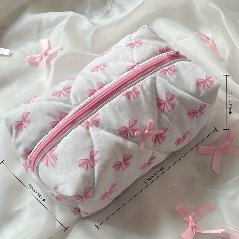 Дуже просторо, вміщує багато менших косметики, виготовленої з чарівної стьобаної тканини з друком у дуже модному та популярному солодкому стилі: #coquette #girlygirl #lolita #lolita #ballerinacore або #pinkaesthetic.