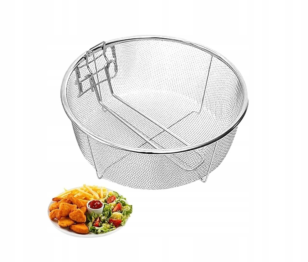 Багатофункціональний кошик має спеціальну основу з ніжками, які захищають смажені у фритюрі продукти від прилипання. Складна ручка дозволяє ефективно стікати жир. Ви можете зручно смажити картоплю фрі, картопляні кульки або фаворкі.