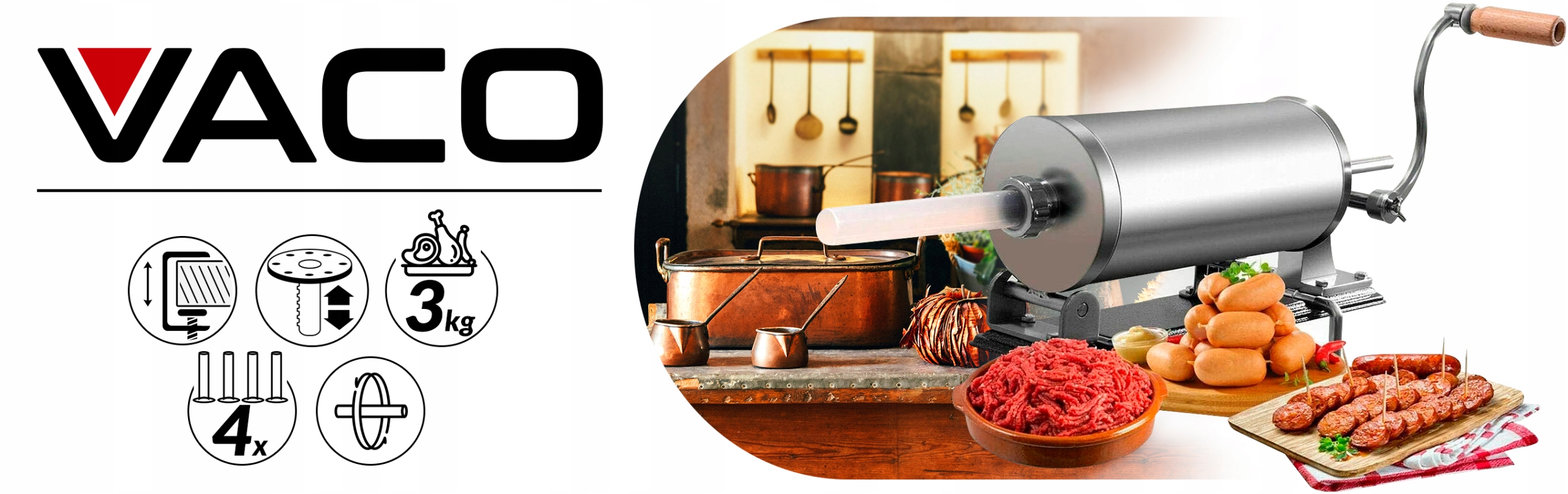 Начинка Vaco дозволить швидко приготувати свіже м'ясо - домашні запашні ковбаски, сосиски кабанос або улюблені дітьми сосиски. Ви можете зробити все це вдвічі швидше.