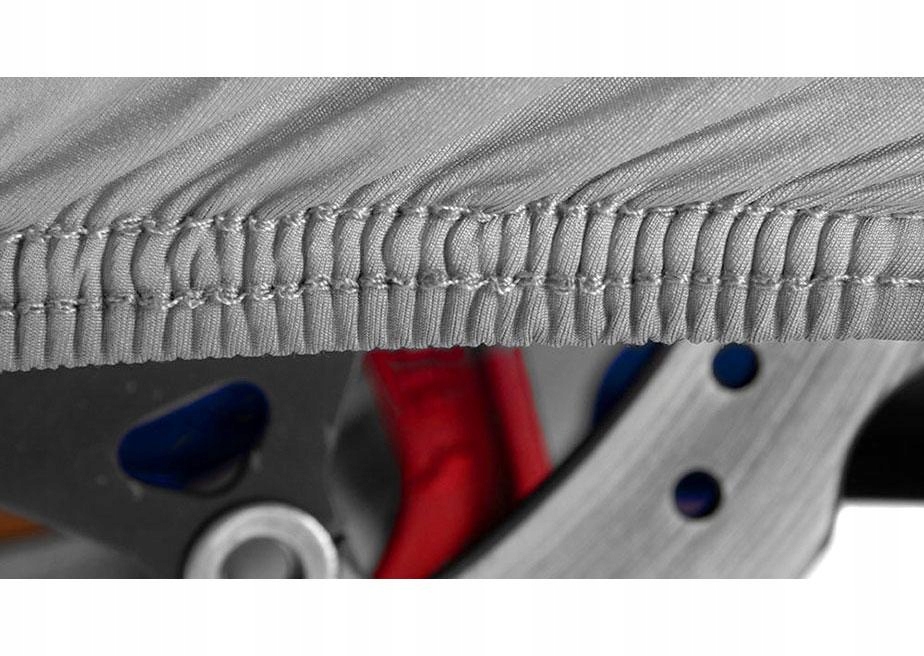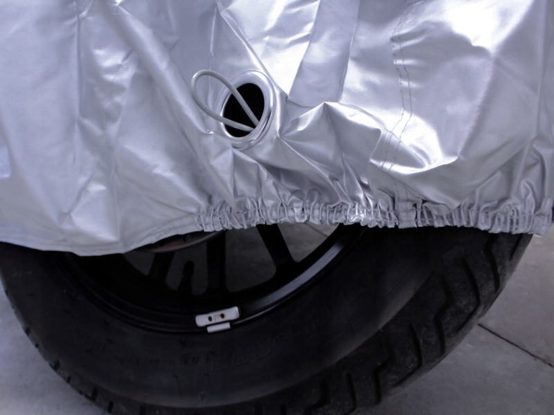 внизу, посередині до кришки, зшивали хомути для кріплення під мотоциклом. Смуги ефективно зберігають кришку на своєму місці, мінімізуючи ризик ковзати її, навіть під час дуже сильного вітру.