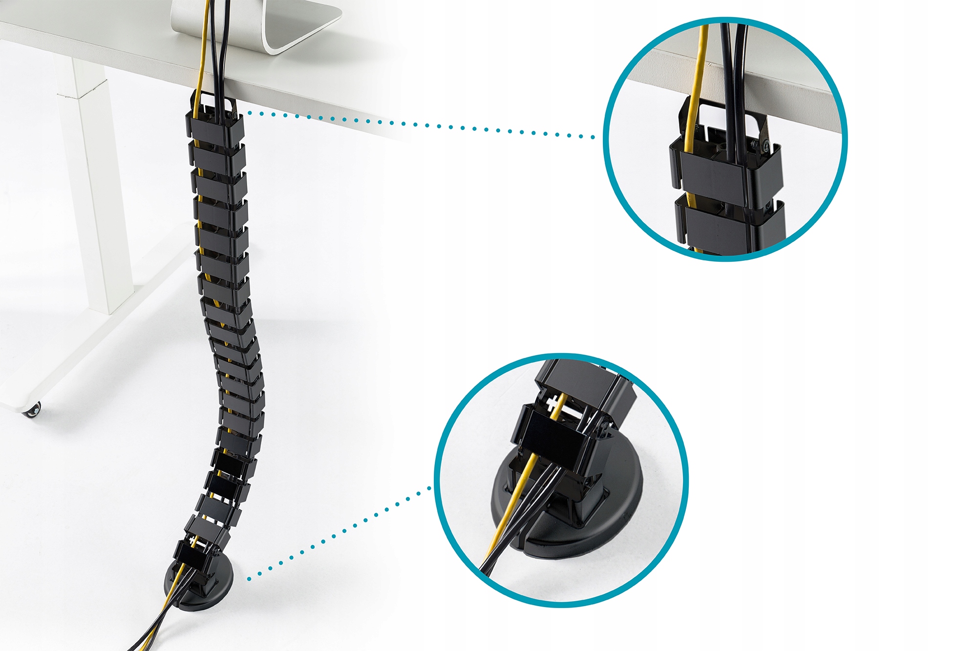 - Кабельний шланг є ідеальним доповненням до столів з регульованою висотою та окремо стоячих столів. Це допомагає приховати кабелі, що ведуть від підлоги до стільниці.