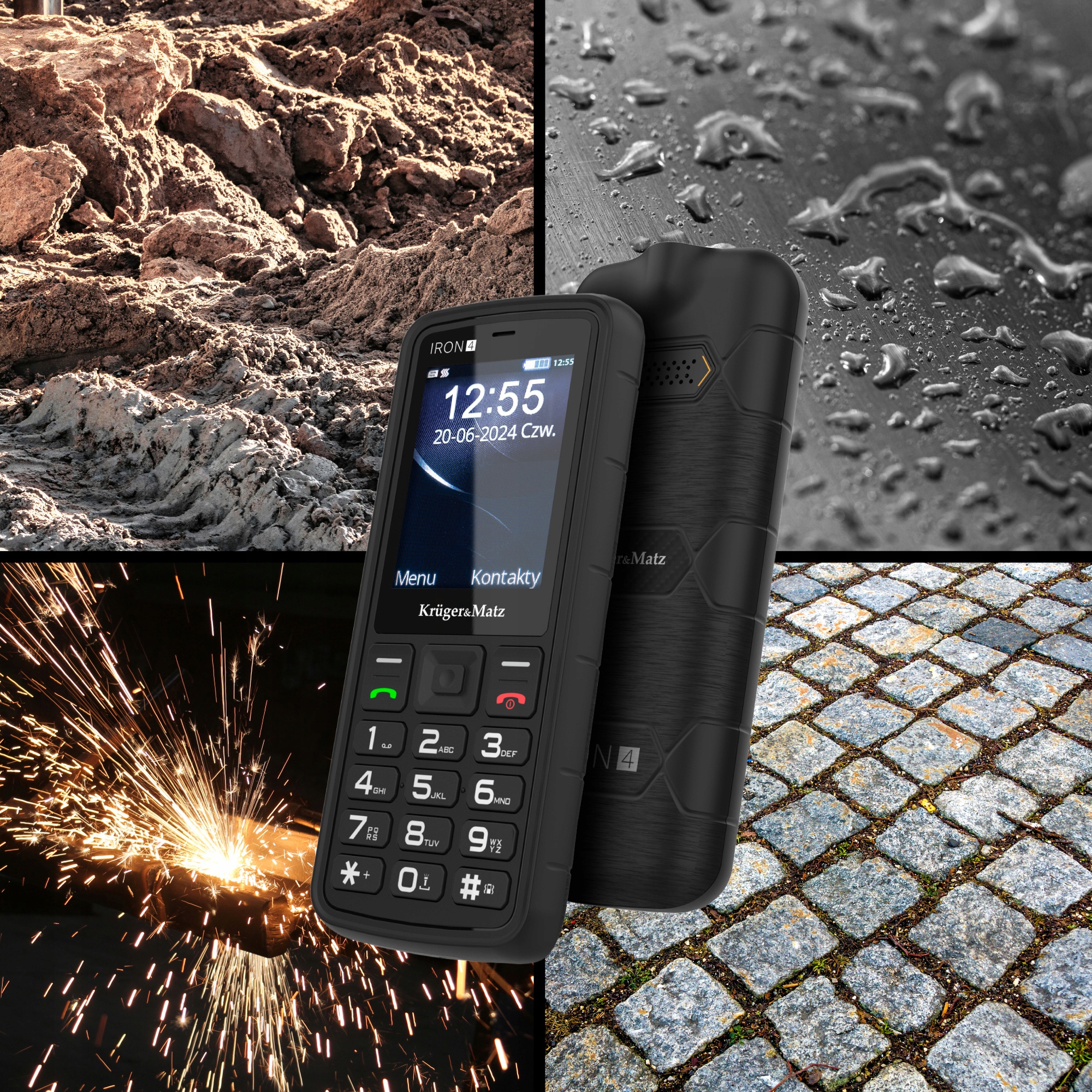 Kruger & Matz Iron 4 - це пропозиція для людей, які вище вдосконалених функцій та додатків ставлять міцність пристрою у щоденному використанні. Ця модель характеризується посиленим корпусом, який забезпечує стійкість до удару, пилу та бризок. З цієї причини Iron 4 стане ідеальним вибором для будівельних робітників, екстремальних спортсменів та любителів пригод на свіжому повітрі.