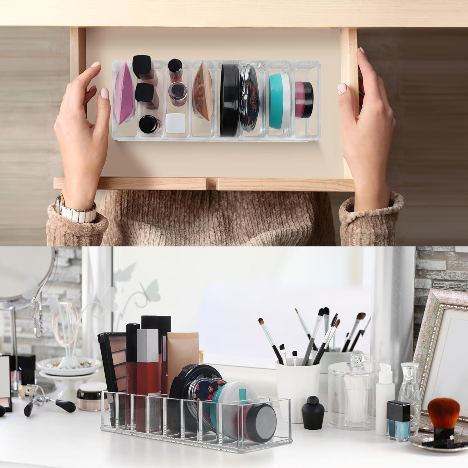 Наш організатор макіяжу містить 8 відсіків для зберігання аксесуарів для макіяжу. Кожна камера має розміри 7,5 см х 2,5 см, що дає достатньо місця для рум'ян, тіней для очей та порошку. Акрил міцний і довговічний. Оскільки конструкція дуже нейтральна, вона відповідатиме будь -якій прикрасі.