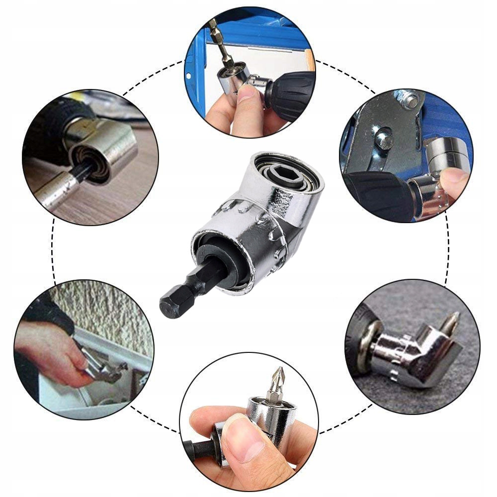 Прямий кутовий адаптер із шестірнею. Корисно під час роботи у важкодоступних місцях. Обертається в обох напрямках. Його можна під’єднати до електричної дрилі, зарядної дрилі або ручного ключа, який можна висунути у вузький простір, до якого він не може дістатися, а потім повернути гвинт.