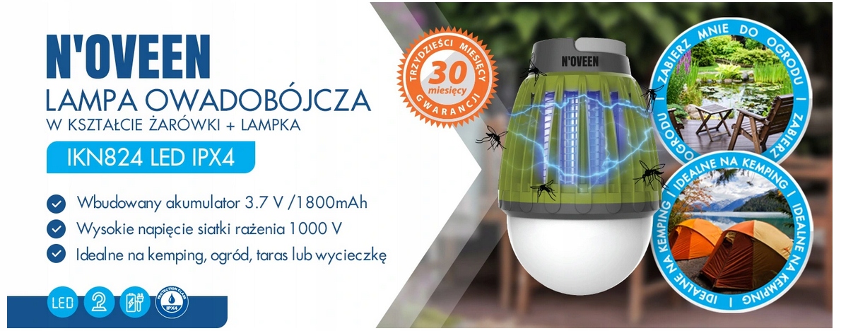 Бездротова інсектицидна лампа IKN824 LED IPX4 – це поєднання функцій освітлення з ефективним контролем комах у місцях, де немає доступу до постійного живлення, наприклад, кемпінг.