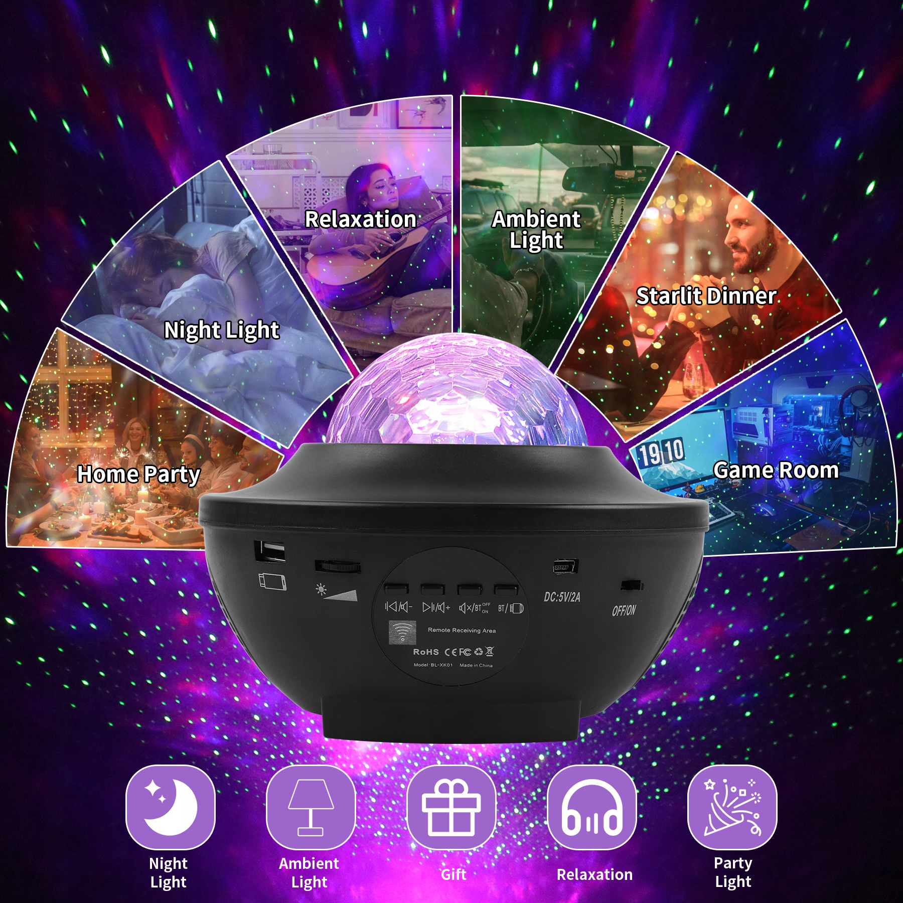 Нічний проектор із зоряним небом ідеально підходить для оформлення будь-якого фестивалю, підходить для танцювального залу, дискотеки, Різдва, дня народження, клубу, бару, сімейних зустрічей тощо. Створює чудову зоряну атмосферу, яка допомагає дітям стимулювати їхню цікавість, уяву та творчий потенціал. Чудова ідея подарунка на будь-який сезон, для родини, закоханих, друзів.