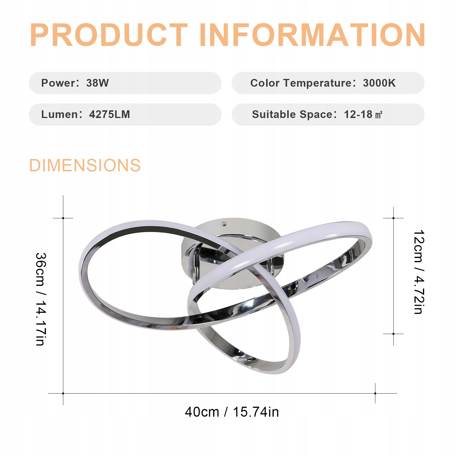 LAMPA SUFITOWA LED NOWOCZESNY ŻYRANDOL CHROM 38W 3000K DO SYPIALNI,KUCHNI