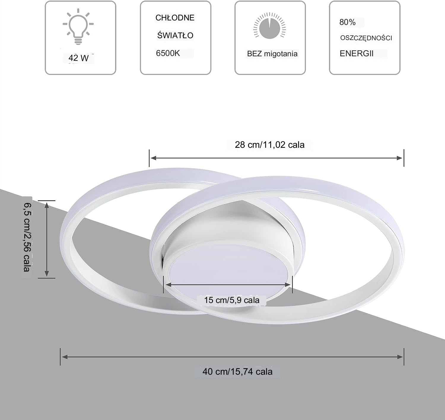 Цей подвійний круглий світлодіодний стельовий світильник має яскраве біле світло потужністю 42 Вт, яке зробить вашу кімнату світлою, як удень. Колірна температура становить 6500 К, що забезпечує холодне та яскраве освітлення в приміщенні.
