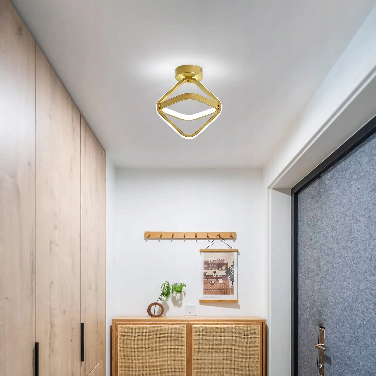 Зовнішній вигляд цієї перехресної стельової лампи золотий, два квадрати переплітаються разом, і тривимірний ефект сильний;